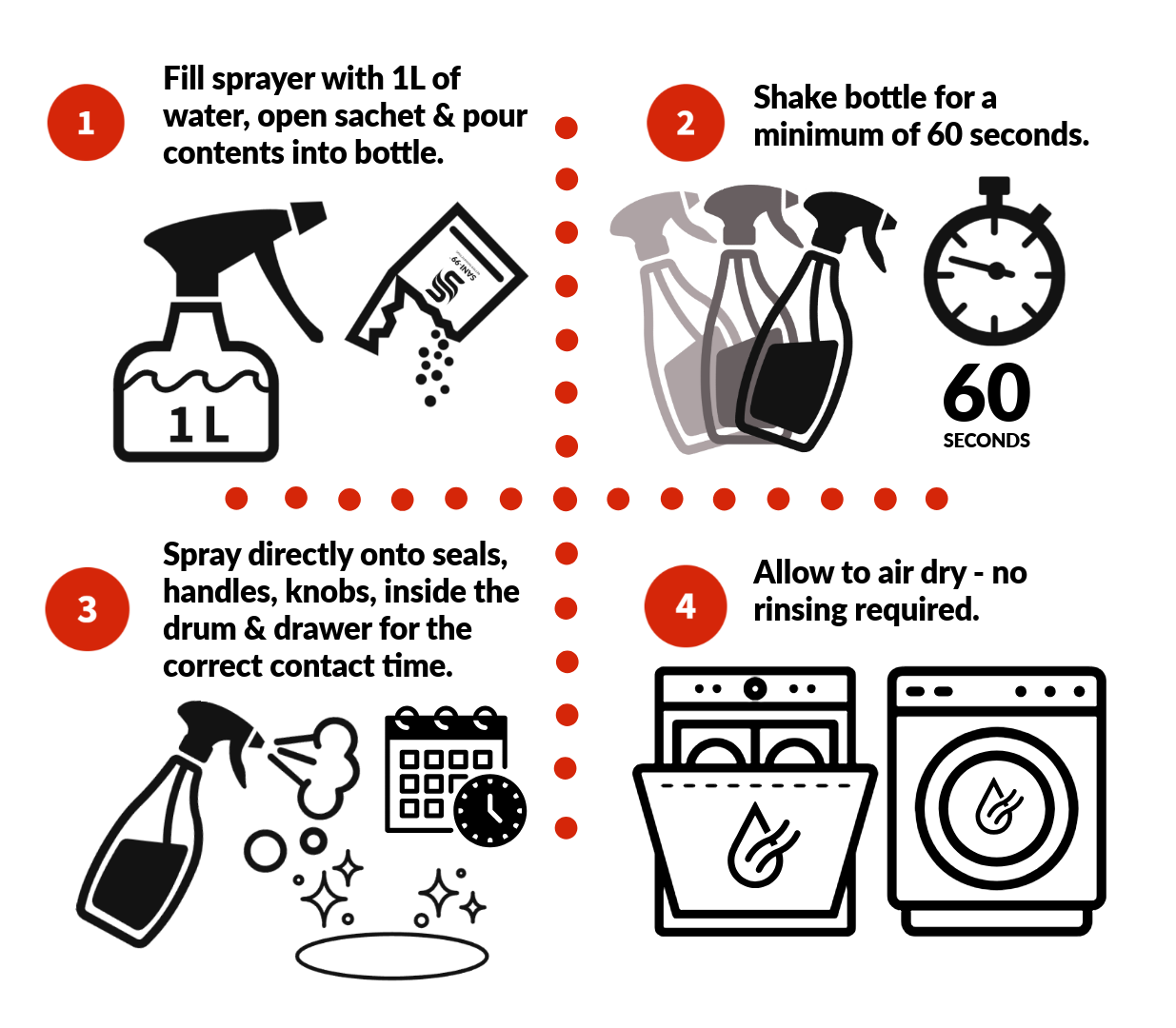 Getting started with SANI-99™ in your dishwasher or washing machine is quick and simple. For deep disinfection, just pour sachets directly into the detergent drawer and run a cycle. For everyday hygiene, mix, spray, and let the surfaces dry. In a few easy steps, you can keep drums, seals, drawers, and handles protected without harsh bleach, strong odours, or complicated processes.