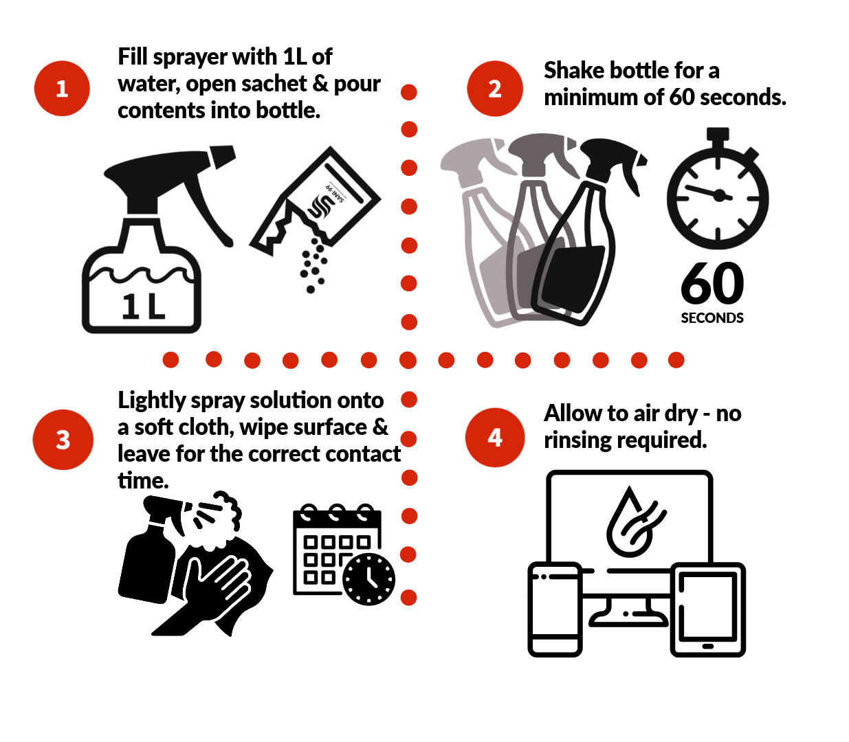 - Viruses (Norovirus, Influenza, Coronaviruses) — neutralised in under 5 minutes.