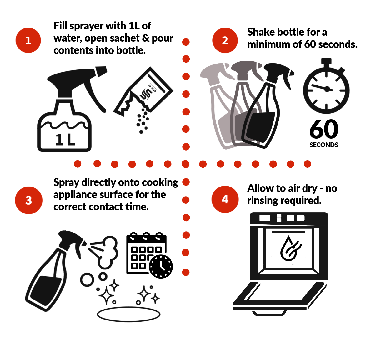 Getting started with SANI-99™ in your oven, microwave, or BBQ is quick and simple. Our disinfectant is designed to fit seamlessly into your cleaning routine — just mix, spray, wipe, and let the surface air dry. In four easy steps, you can keep cooking and food-contact areas protected without harsh bleach, strong odours, or complicated processes.